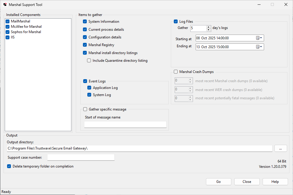 The Marshal support tool has been developed to help the Trustwave Technical Support team gather information about installed software and configuration. The tool produces a single .zip file that contains essential information to help the support team debug specific issues.