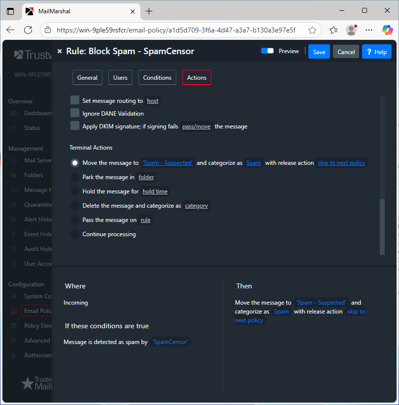 - Select the desired action for this rule and then click Save. On the main rule definition window click Save again.