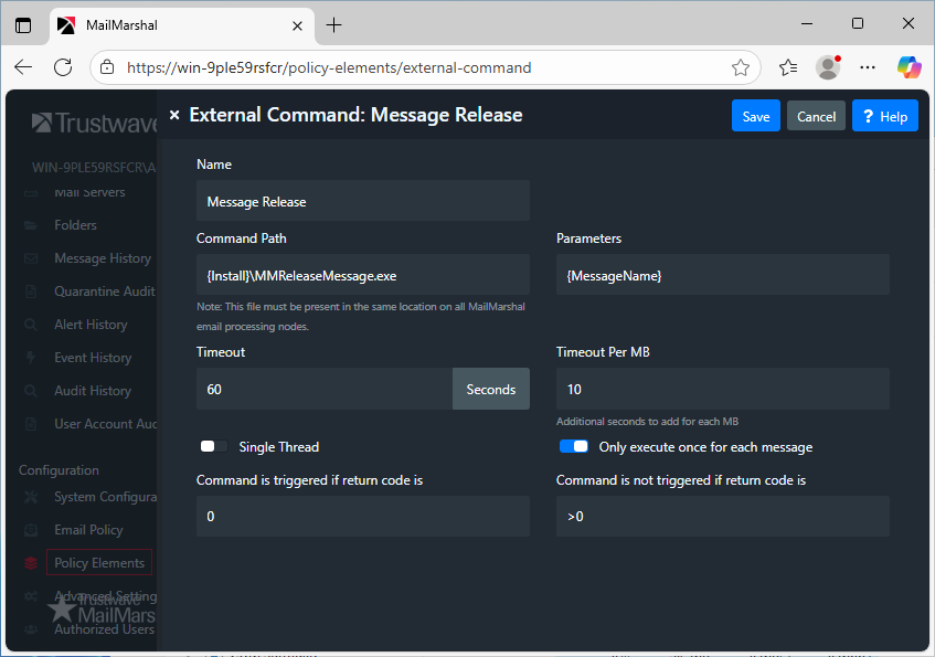 This article provides basic information about how to set up and configure the external command. For more details search for 'message release' and 'external command' in the User Guide for your version. User guides are available on the MailMarshal SMTP documentation page or MailMarshal Exchange documentation page (requires login).