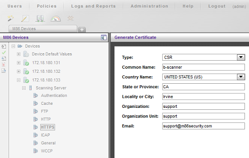 1. Navigate to the Devices section in Trustwave SWG GUI, right-click the HTTPS module on the scanner and choose Generate Certificate option: