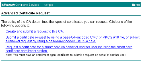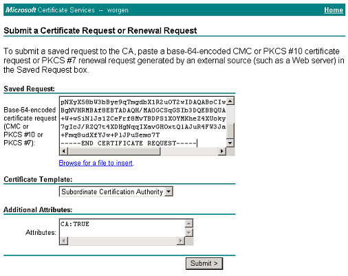 7. Choose the option to submit CSR by using a base-64-encoded CMC or PKCS#10 file: