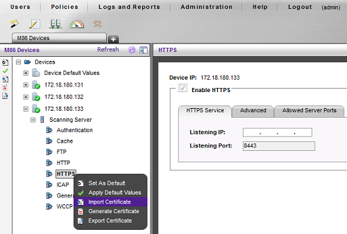 12. Navigate to the Devices section in Trustwave SWG GUI, right-click the HTTPS module on the scanner and choose Import Certificate option: