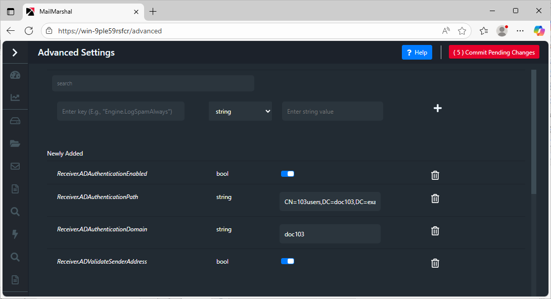- In MailMarshal 10.0 and above, open the Management Console and navigate to Advanced Settings. Add the following value entries: